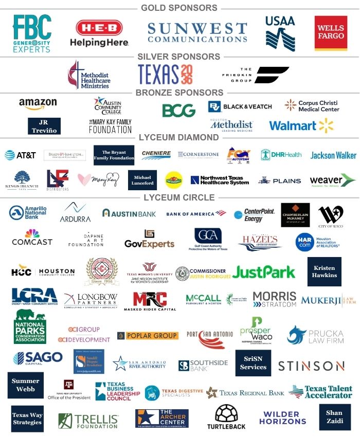 In addition to our programs, we will release the results from our nationally acclaimed Texas Lyceum Poll at the Public Conference in Houston. We have partnered with Texas A&M University, Texas Tech University, Texas Southern University and the University of Texas for our Texas Lyceum Fellowship Program. At each meeting throughout the year, our Fellows will release innovative research regarding each conference topic. Your support of the Texas Lyceum allows us to continue our statewide mission of identifying the next generation of leaders through the Texas Lyceum Fellowship Program, fostering dialogue on important issues, providing a forum for participating in policy discussions on significant issues, and access to influential leaders throughout Texas. We hope you will consider supporting us in 2026. For our returning sponsors, we are grateful for your continued interest, commitment, and support of the Texas Lyceum. Please contact us for additional information or to confirm your 2026 sponsorship. Please contact Vice Presidents of Development and Stewardship, Elizabeth Fazio Hale, Matt Garcia, Angie Rosales ([email protected]) or me ([email protected]) to discuss your prospective support. Sincere thanks for your consideration, 2026 Sponsorship Packet2026 Sponsor Commitment Form2026 Meeting Sponsor FormTHANK YOU TO OUR TEXAS LYCEUM 2026 ANNUAL SPONSORS